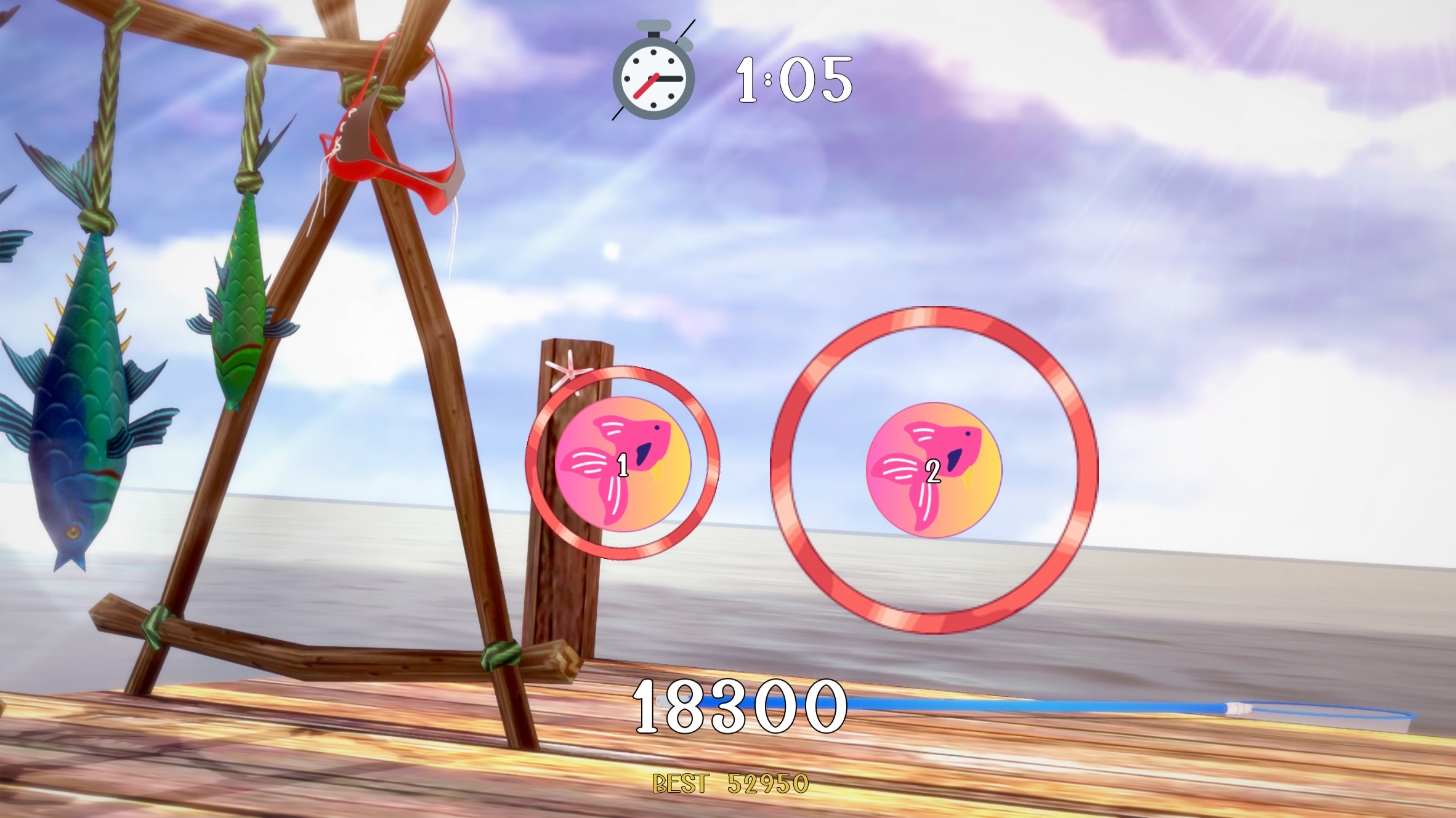 Cast your line and tap to the beat! Circles appear on screen and shrink toward their target. Click at the right moment for a Perfect or Good, miss too many and the fish gets away. As you rack up catches, the difficulty ramps up with faster circles, sequence-locked notes, and slider sections that require you to hold and drag to the goal.